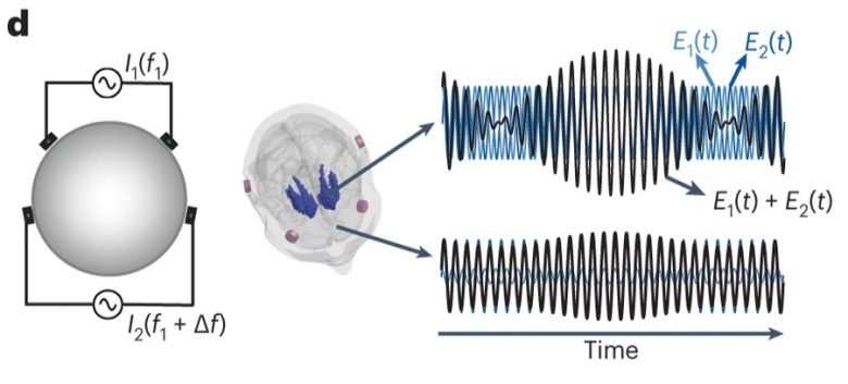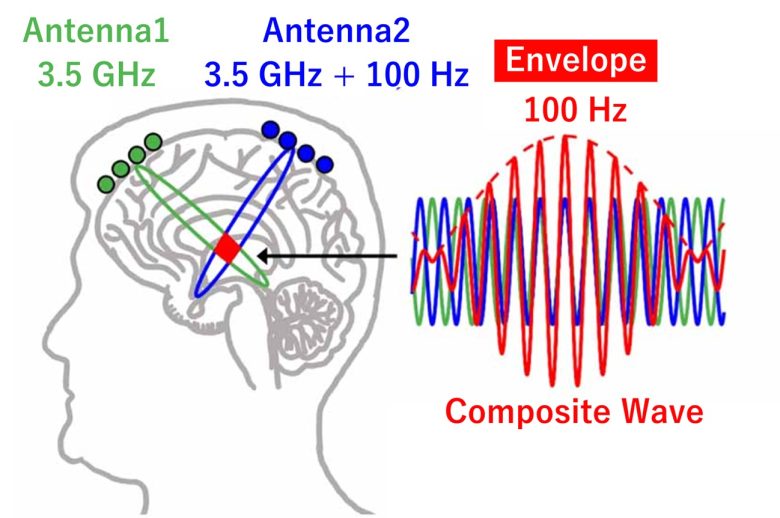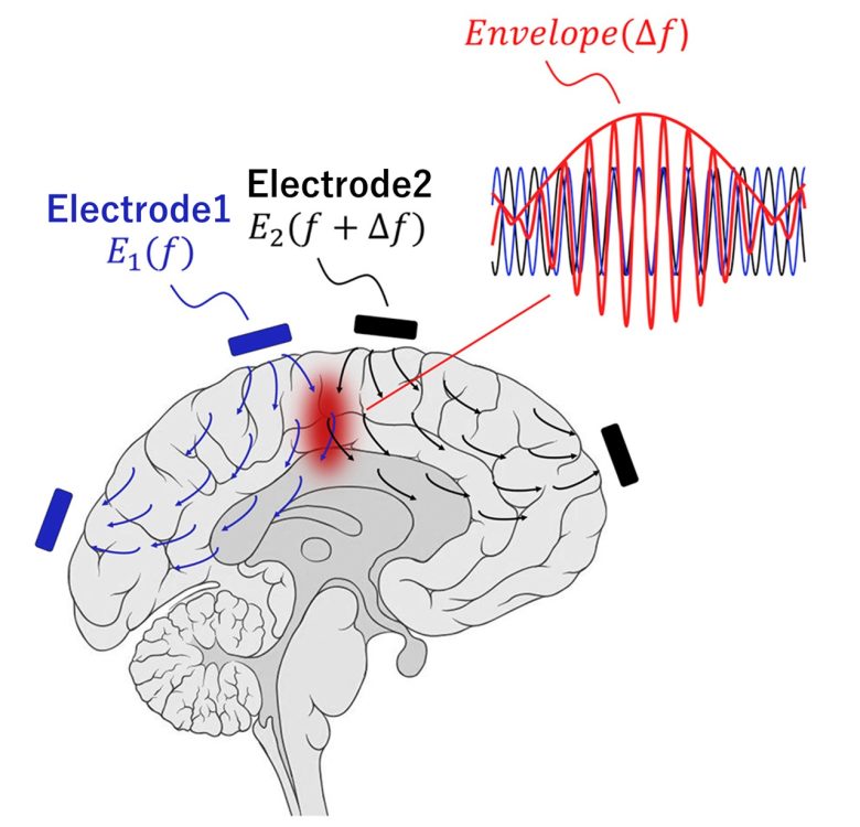 Recently, a technique called "temporal interference (TI) stimulation" was developed, where two currents of slightly different frequencies are applied to the head, creating an extremely low-frequency composite wave at the intersection to activate specific deep brain sites through brain entrainment.