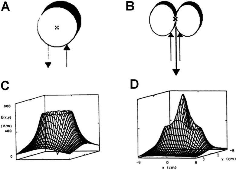 Coils come in many shapes, with circular coils being relatively powerful, and figure-eight coils being more focused and producing maximum power at the intersection of the two coils. (Hallett 2007)