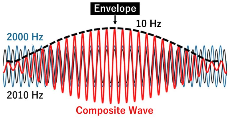 In the experiment, two ultrasonic waves of 1.75 MHz and 2.25 MHz were superimposed to generate a 2 MHz composite wave with an envelope of 500 kHz.