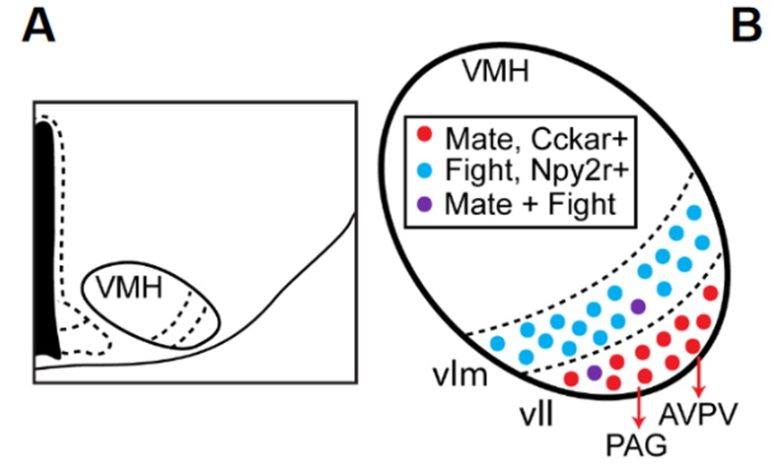 The VMH is also a region that produces aggression, but it is subdivided into topographically distinct subregions for sexual behavior and aggression.