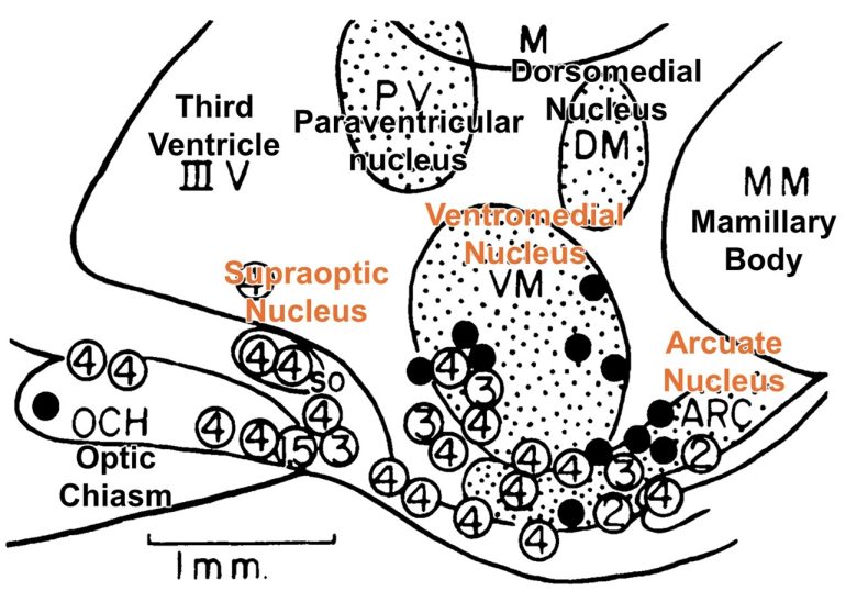 A UCLA study explored the sites that induce ovulation by electrical stimulation in the tuber cinereum of the hypothalamus in rats. (Critchlow 1958)
