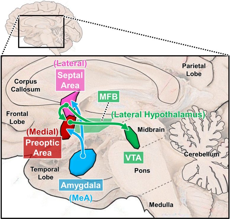 MeA = medial nucleus of the amygdala; MFB = medial forebrain bundle; VTA = ventral tegmental area.