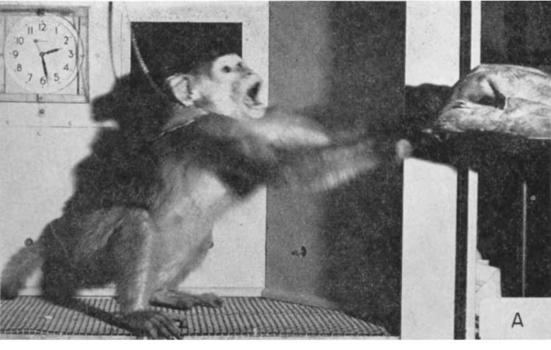 If a glove, a stick, or the experimenter’s hand suddenly approached a monkey, it usually opened its mouth, showing teeth, moved its head forward, vocalized with a characteristic low-toned sound, and tried to grab, to scratch, and to bite.