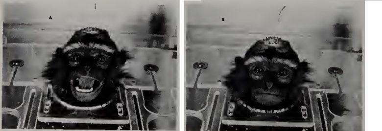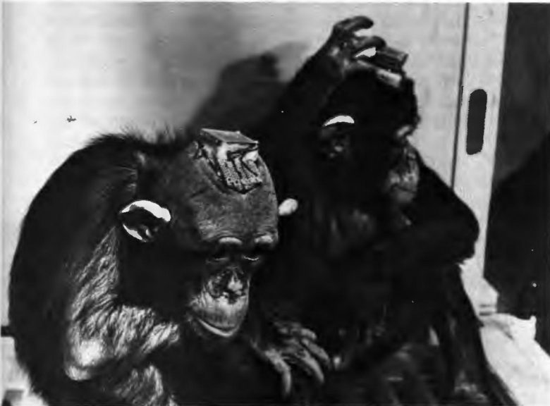 Two chimpanzees with the stimoceiver attached. Paddy on the left and Carlos on the right. (Delgado 1970)