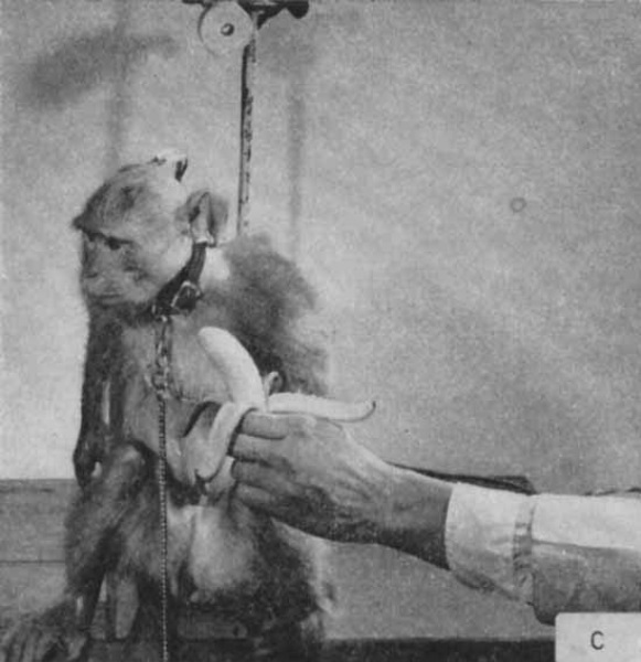 It was then safe to touch the monkey, and even to put a finger in its mouth. When a glove or stick came near its face, the monkey used its hand to push it away without attacking.