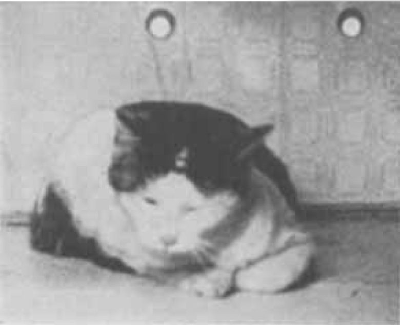In fact, however, the cat would remain motionless in a sitting or lying position with its head raised, remaining receptive to all sensory stimuli. This continued for minutes after the stimulation had ceased.