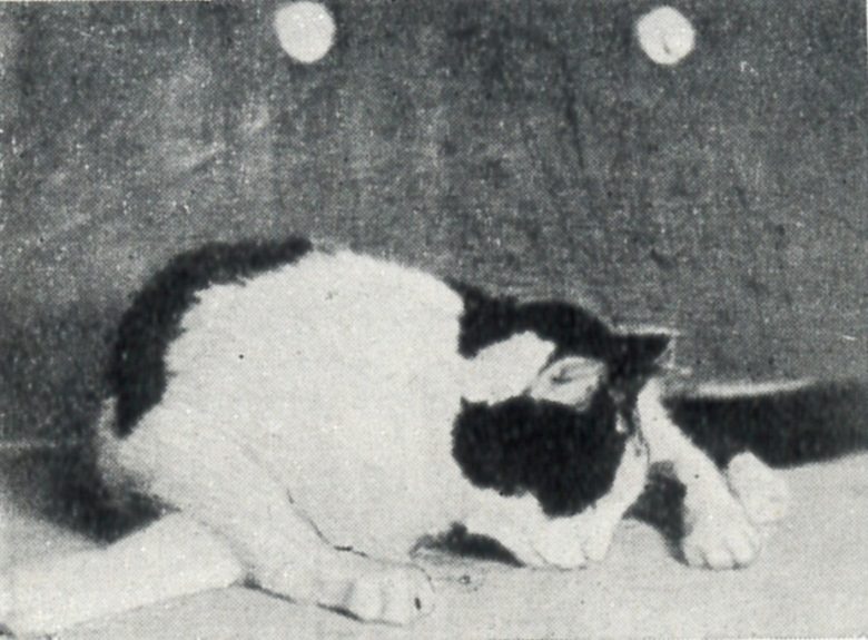 Upon the stimulation the cat did not appear to "pass out" suddenly, but would seek a comfortable position, which was sometimes not found until after a few postural adjustments.
