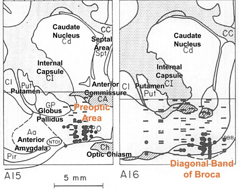 Specifically, this was the region extending from the diagonal band of Broca to the lateral preoptic area.