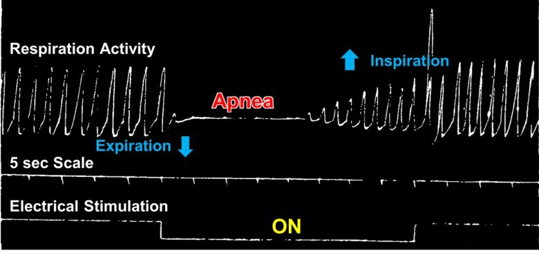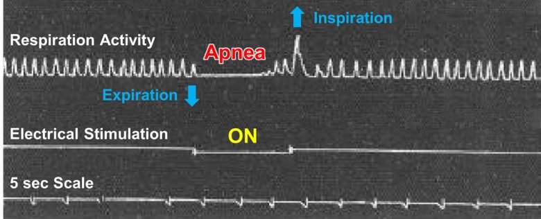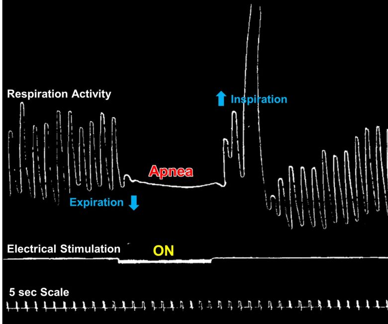 Changes in breathing were observed during stimulation, whereas taking a deep breath was observed most often at the end of the stimulation. (The nature of the response strongly indicates that apnea was actually induced.)