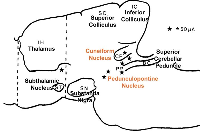 They found that walking can be induced not only from the cuneiform nucleus but also from the pedunculopontine nucleus.
