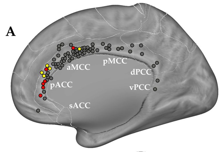 The sites that induced laughter were concentrated in the pregenual part of the anterior cingulate cortex (pACC).