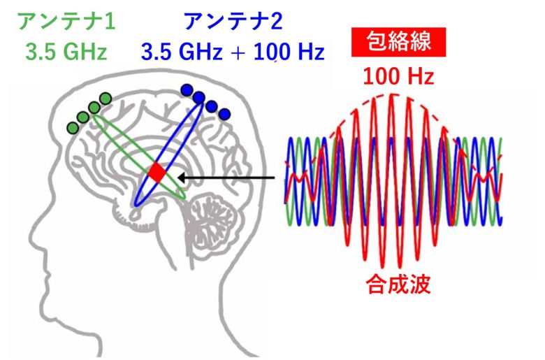ワシントン大学の研究者は、周波数が異なる2つの超音波を照射し、その交差点で形成される合成波で神経を活性化する技術を開発しました。(Mehić et al. 2014)