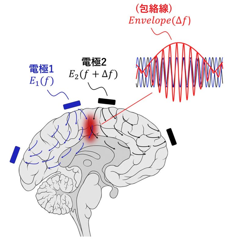 近年、「時間干渉刺激 (TI刺激)」と呼ばれる技術が開発されました。これは、周波数がわずかに異なる2つの電流を頭部に加えることで、その交差点に極低周波の合成波を形成し、脳同調によって脳深部の特定部位を活性化するものです。