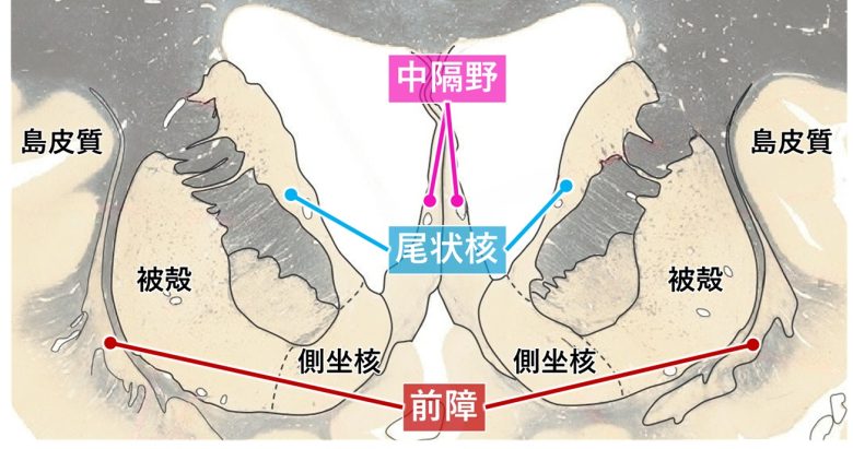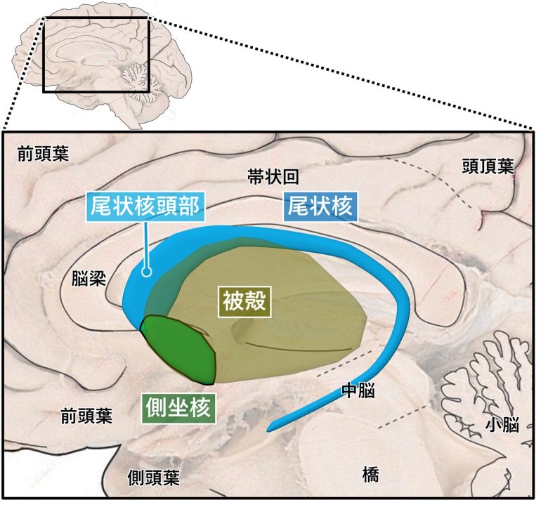 線条体は尾状核、被殻、腹側線条体・側坐核の3つの核から構成されています。