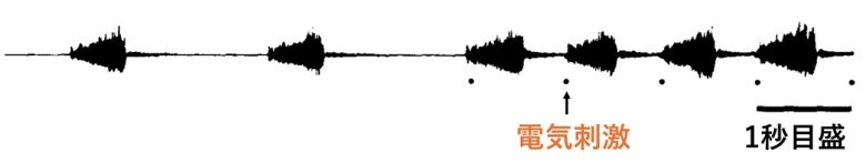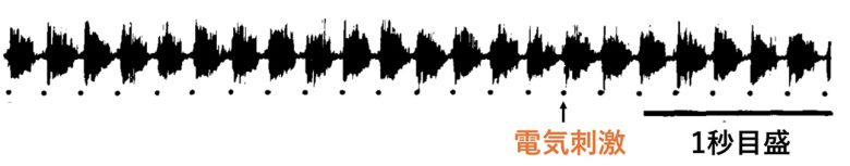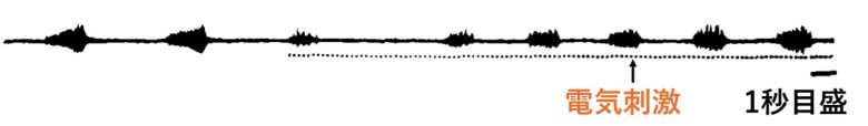 弱い刺激では、刺激開始から2~5秒後に反対側の後肢が動き始め、刺激終了後も2~3秒間動き続けました。