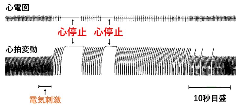 視床下部の後部に電気刺激を加えると高血圧が生じ、約125 mmHgから200 mmHgへの顕著な上昇がみられました。また刺激終了後に、期外収縮が頻繁に発生しました。