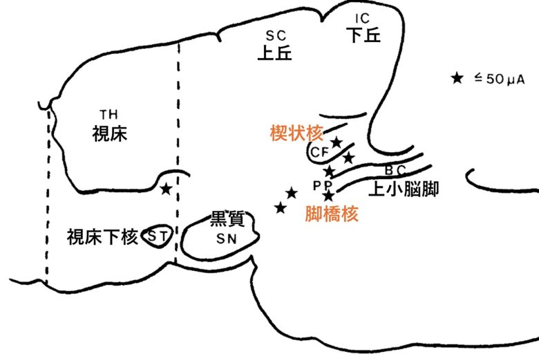 電極は小脳核と脳幹の前庭神経核、網様体、その他多くの脳幹構造に配置され、電気刺激によって基本的運動を生み出す地点が200箇所以上見つかりました。